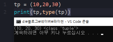 튜플은 ()를 씁니다. (여기서 type함수는 변수의 자료형을 알려주는 함수 입니다.)