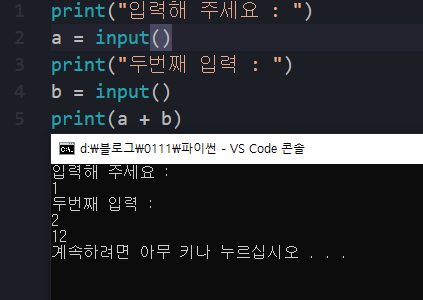 분명 1하고 2를 입력하고 더했는데 왜 12가 나오지요? 3이 나와야 하는 거 아닌가요?