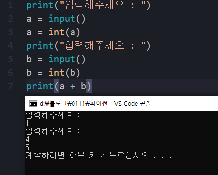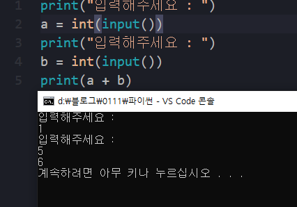 아까 까지는 print에다가 출력하고 싶은 말을 썼는데, 지금은 input안에 출력하고 싶은 말들을 적었지요?