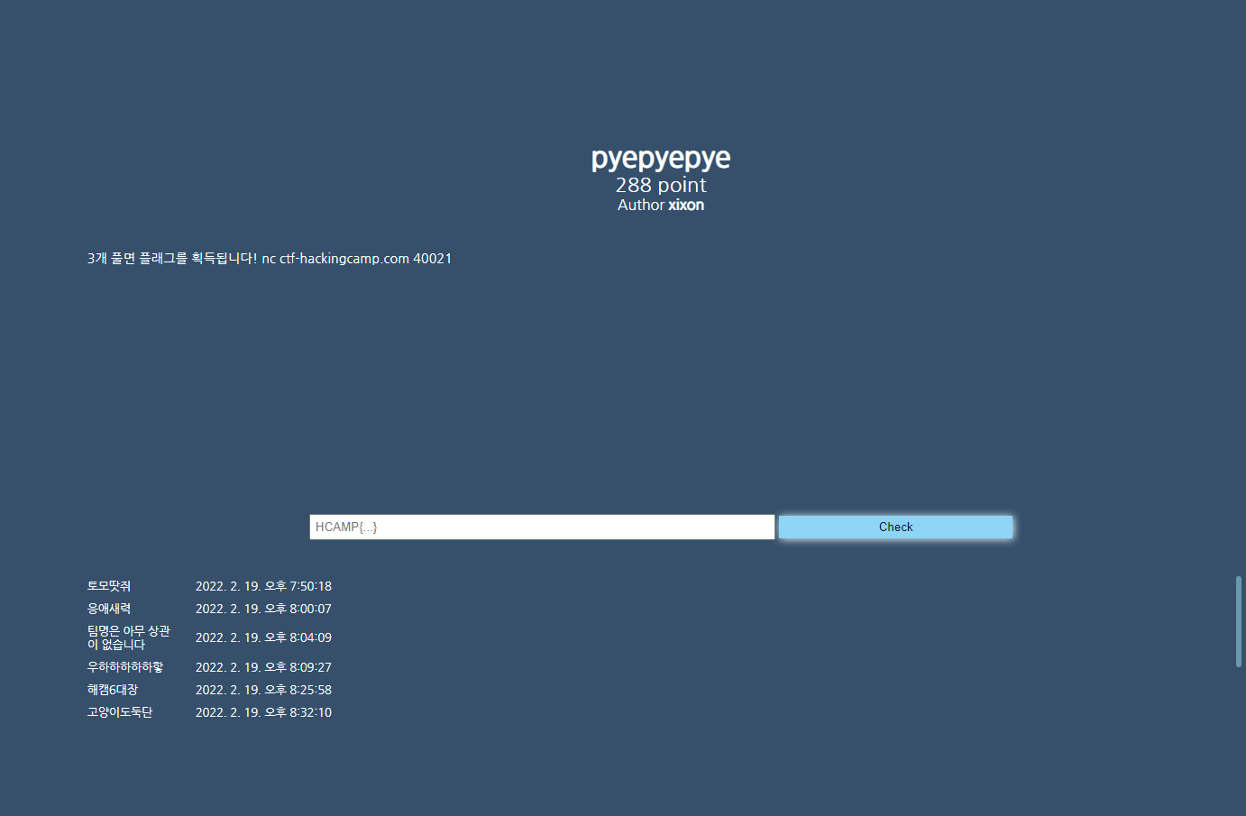 FLAG : HCAMP{pyth0n_1s_g00d_l@ng}