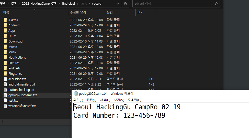 이 문제는 모든 파일을 뒤져본 결과 gpslog2022pamc.txt에 존재하는 것임을 알게 되었다(사용자의 위치와 카드 번호는 민감한 정보이기 때문에 이 파일이 민감한 정보를 담는 파일이라고 판단).
