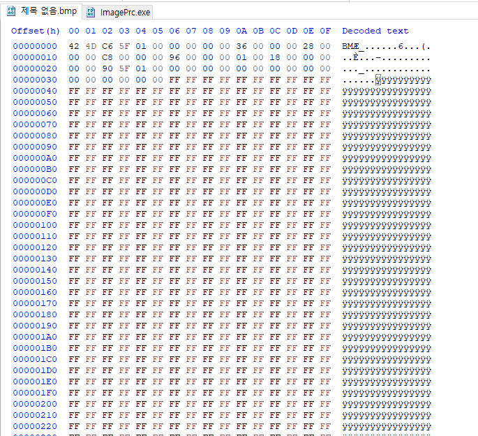 아까 만든 비트맵 파일을 hxd로 열었습니다.