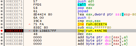 popad밑 jmp로 와서 f7을 눌러줍니다.